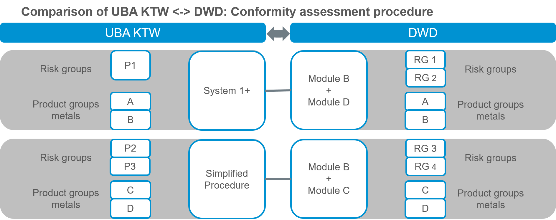For higher-risk products (risk groups R1 and R2, or product groups A and B for metals), conformity assessment procedures Module B and Module D are specified, which are comparable to System 1+ of the KTW. Module B comprises the EU type examination (on withdrawn samples) and Module D comprises the initial inspection as well as annual inspections and annual reduced tests (surveillance tests).