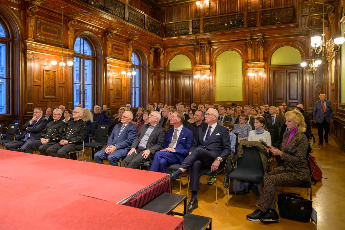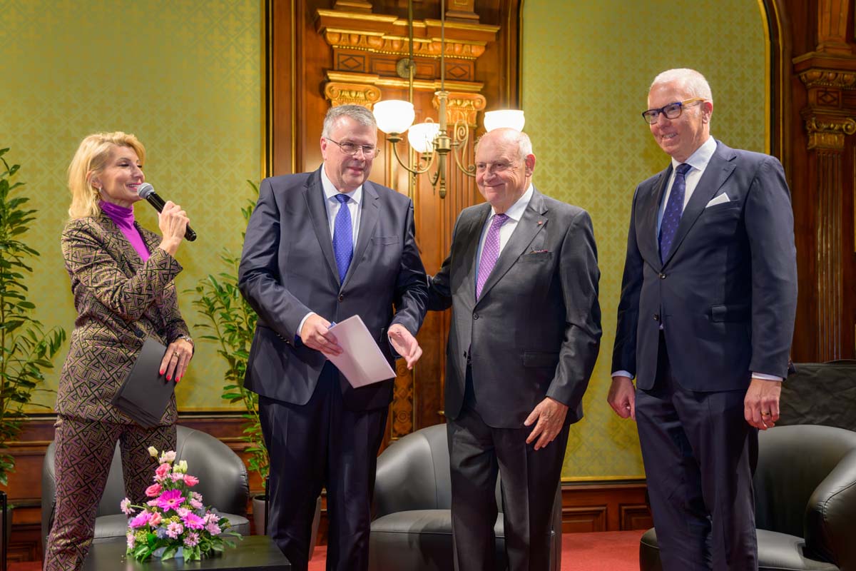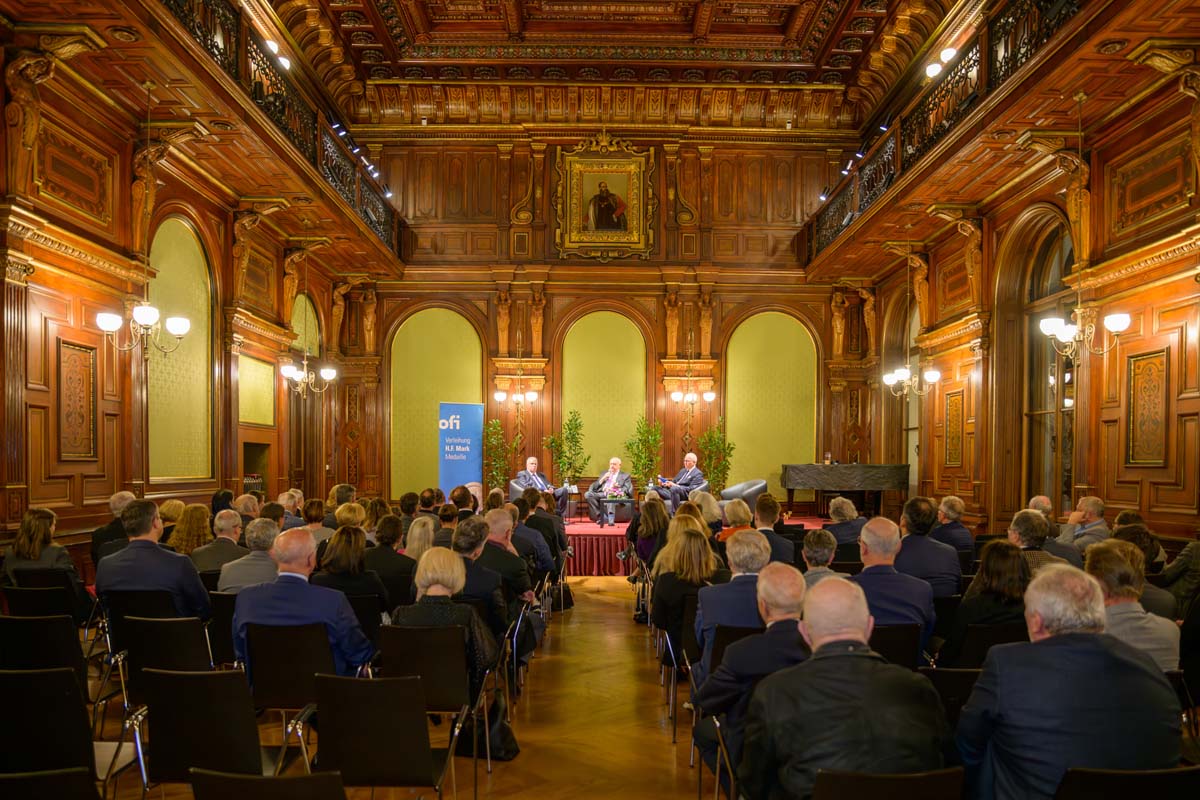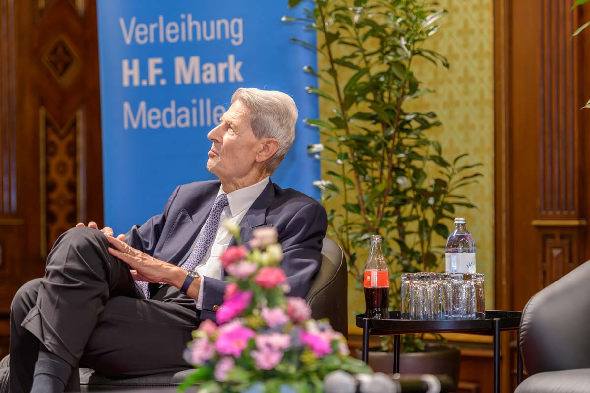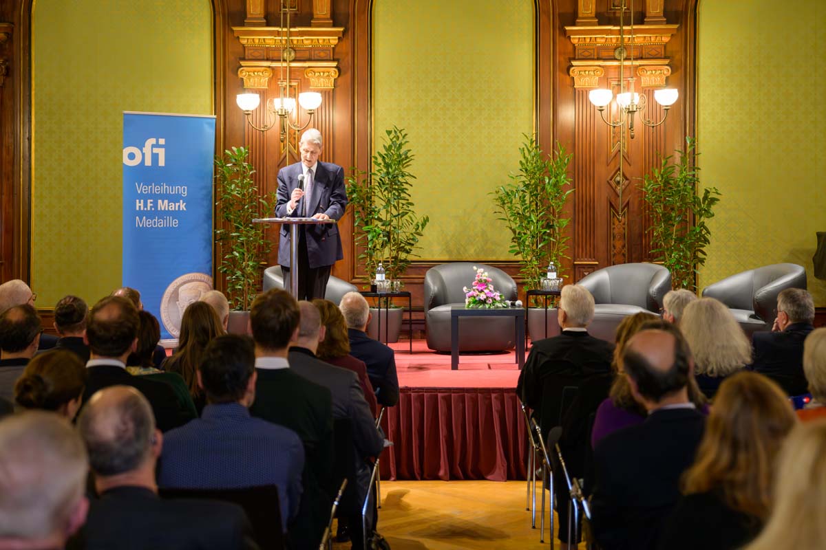 Nadja Mader führte durch einen stimmungsvollen Abend im Haus der Ingenieure, zu dem zahlreiche Gäste im Festsaal zusammenkamen. Neben der feierlichen Verleihung der H.F. Mark Medaillen und des H.F. Mark Sustainability Awards hatten wir mit Odorich von Susani einen besonderen Gast bei uns. Er war einer der letzten Studenten von Mark am Polytechnic Institute of Brooklyn und arbeitete später auch beim Chemiekonzern Du Pont gemeinsam mit dem „Vater der Polymere“.