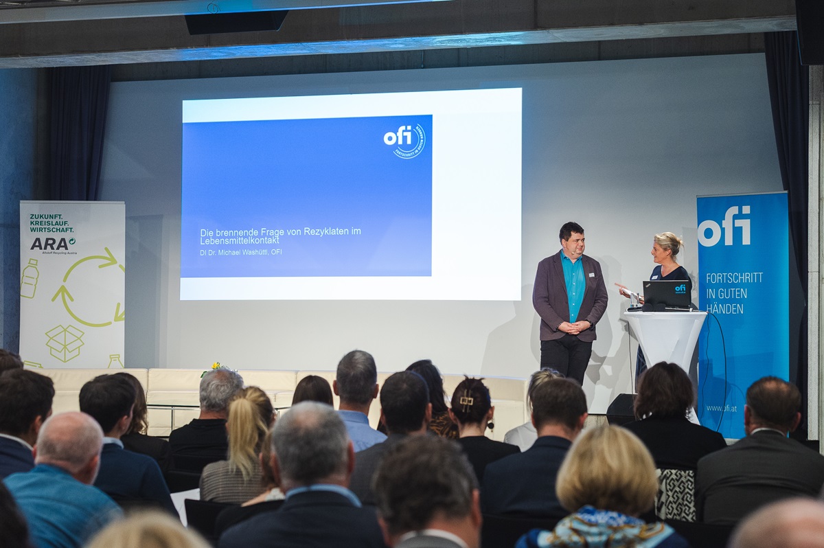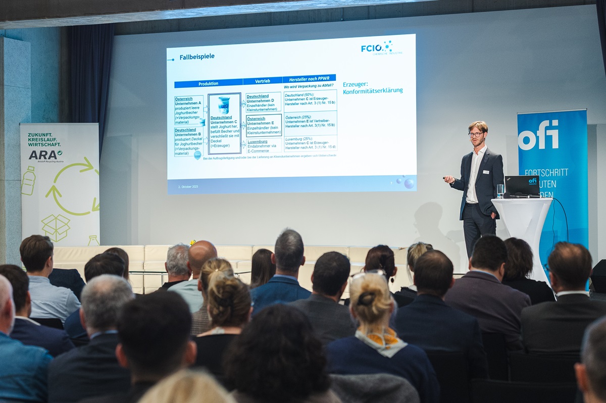 Wie ist der Letztstand zur PPWR und welche Pflichten kommen auf Unternehmen zu? Hierzu gab Dominik Stern (WKO, FCIO) ein umfassendes Update. Weiterer inhaltliche Schwerpunkt stellte der Themenkomplex Rezyklate dar. Sandra Beckamp vom Institut cyclos-HTP erläuterte Ergebnisse der europäischen Normungsgruppe im Themenfeld Recyclingfähigkeit (CEN/TC 261/SC 4). Barbara Zottl (OFI) präsentierte einen Wegweiser für Unternehmen hinsichtlich der neuen Konformitätserklärungen. OFI Verpackungs- und Recyclingexperte Michael Washüttl widmete sich der Frage von Rezyklaten im Lebensmittelkontakt. Was gilt für betroffene Unternehmen ab 2026? Dazu gab Dieter Schuch (ARA) einen kompakten Überblick. Last but not least unterstrich Andreas Streit (REWE Group) mit „Die PPWR, Herausforderung oder Chancen für den Handel?“ den Blick auf die Multifunktionalität von Verpackungen nicht außer Acht zu lassen und die PPWR tatsächlich auch als Chance zu sehen.