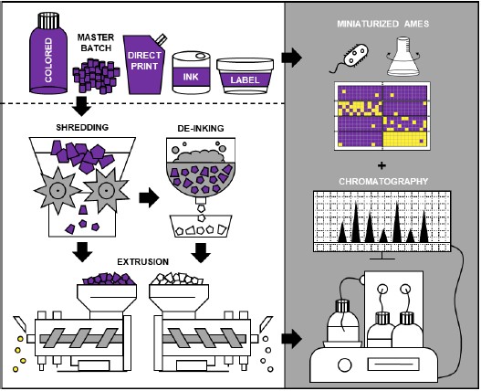 Für den Einsatz von Polyolefin- und PS-Rezyklaten im Lebensmittelkontakt müssen diese Substanzen entfernt bzw. ausgeschlossen werden. Da dekorative Elemente (wie z.B. Druckfarben) eine komplexe chemische Zusammensetzung aufweisen und verschiedenste Typen an farbgebenden Elementen zum Einsatz kommen, wird im Projekt ColourCycle weiter erforscht, welche farbigen Komponenten in Verpackungen im Recycling zu der Entstehung von DNA-reaktiven, mutagenen Substanzen führen und wie man diese z.B. mittels Deinking (Entfernung der Druckfarbe) entfernen kann. Dafür analysiert man definierte farbige und deinkte Proben mittels chemischer Analytik und in vitro Bioassays und gewinnt so Rückschlüsse auf Materialien und Deinking-Prozesse. Um eine kleine Menge an definierten Proben im Labormaßstab repräsentativ verarbeiten zu können, wird eine Methodik aufgebaut, um die Auswirkungen von Recyclingprozessen auf das Material realitätsnahe zu simulieren. Zudem baut man einen Challenge-Test für Druckfarben auf, der die Effizienz der Deinking-Prozesse ermittelt und so die Entfernung kritischer Substanzen miteinbezieht. Diese Erkenntnisse fließen letztlich in die Bewertung von Rezyklaten ein, sichere Recyclingmaterialien und -prozesse für den Lebensmittelkontakt werden identifiziert.